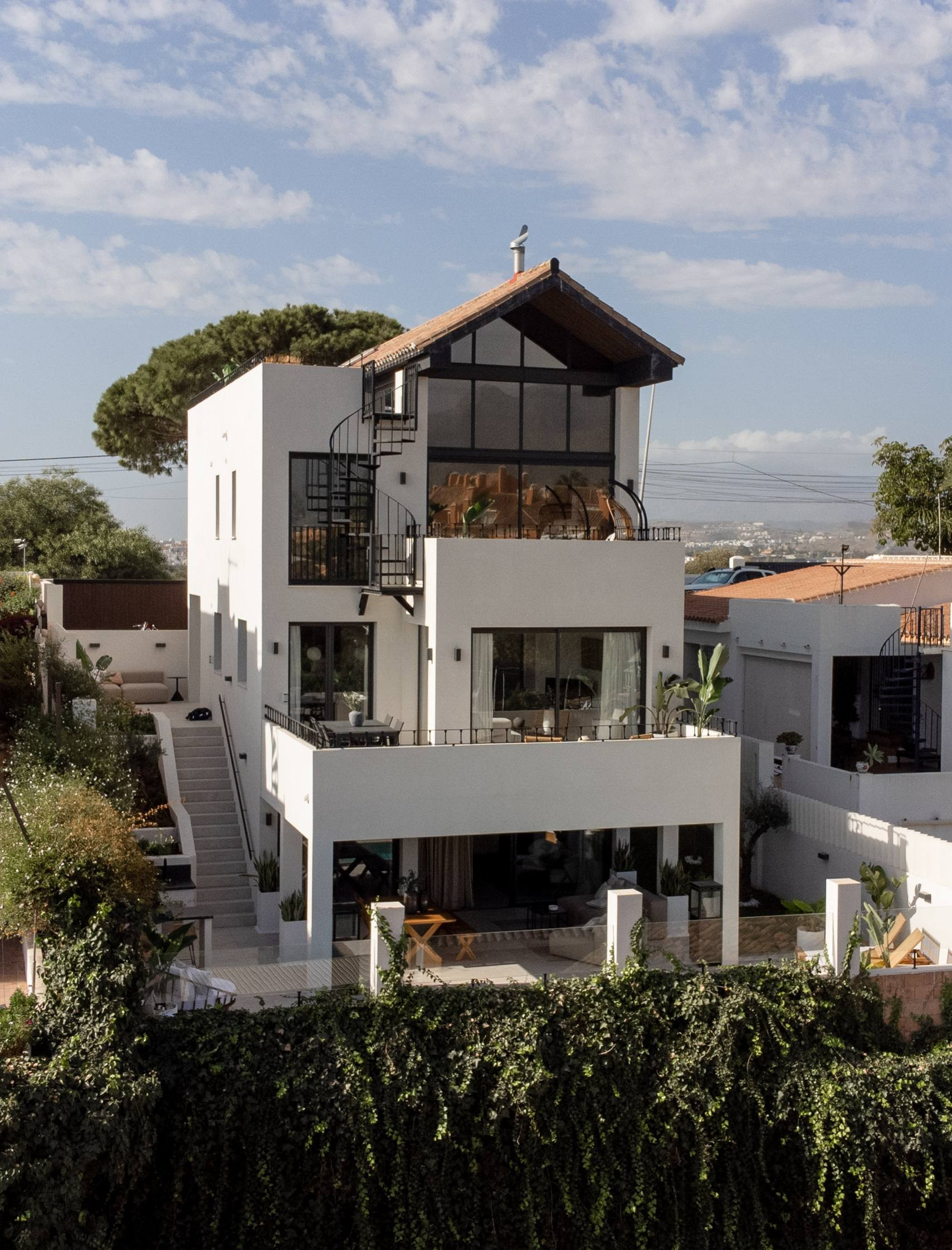 Spread across multiple levels, the home features a bright open-plan layout with floor-to-ceiling windows, modern furnishings, and elegant design throughout. Each bedroom is beautifully appointed, with en-suite bathrooms and thoughtfully curated décor that balances relaxation with style. The main living area opens directly to the garden and pool terrace, while a separate TV room and a quiet workspace offer flexibility for work or winding down.
