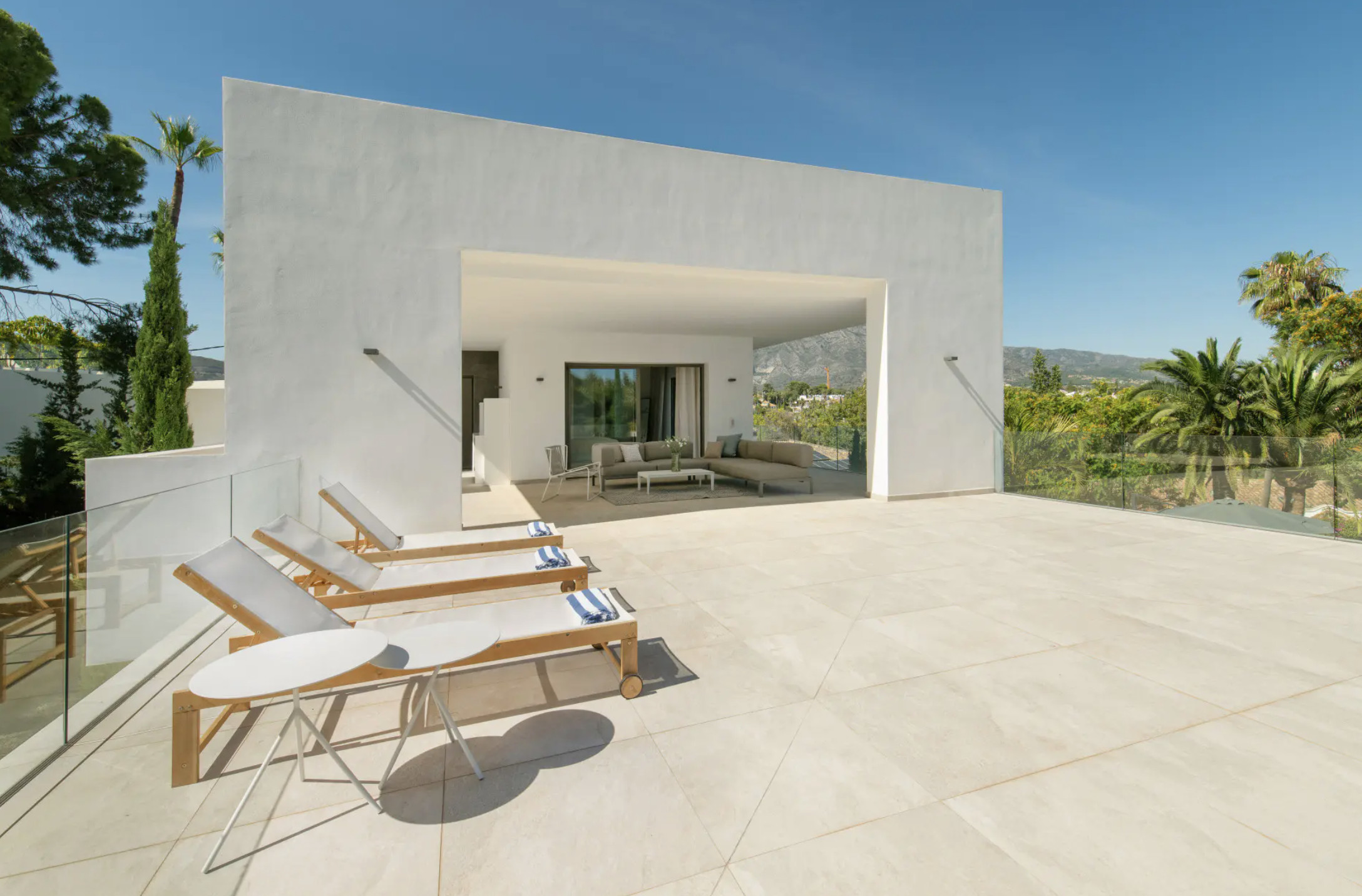 Each of the five spacious bedrooms is en-suite, ensuring privacy and comfort for every guest. The open-plan living area is bright and airy, leading to a sleek, fully equipped kitchen and refined dining space. Floor-to-ceiling windows frame breathtaking views and open out to the villa’s expansive terrace and beautifully landscaped garden. Outdoors, a stunning private pool takes centre stage, surrounded by sun loungers, a stylish fire pit corner, and lush greenery—perfect for soaking up the Marbella sun or enjoying an evening under the stars.