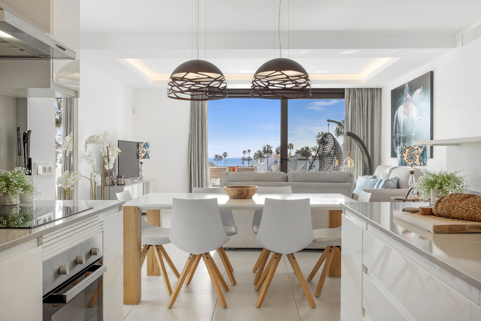 Lägenheten erbjuder ett fräscht, fullt utrustat kök med ett separat förrådsrum. Den rymliga vardagsrum är smakfullt möblerat med ett matbord, stolar och en soffa, noggrant placerade för att njuta av utsikten hela tiden. Det finns också en smart-TV och WiFi.