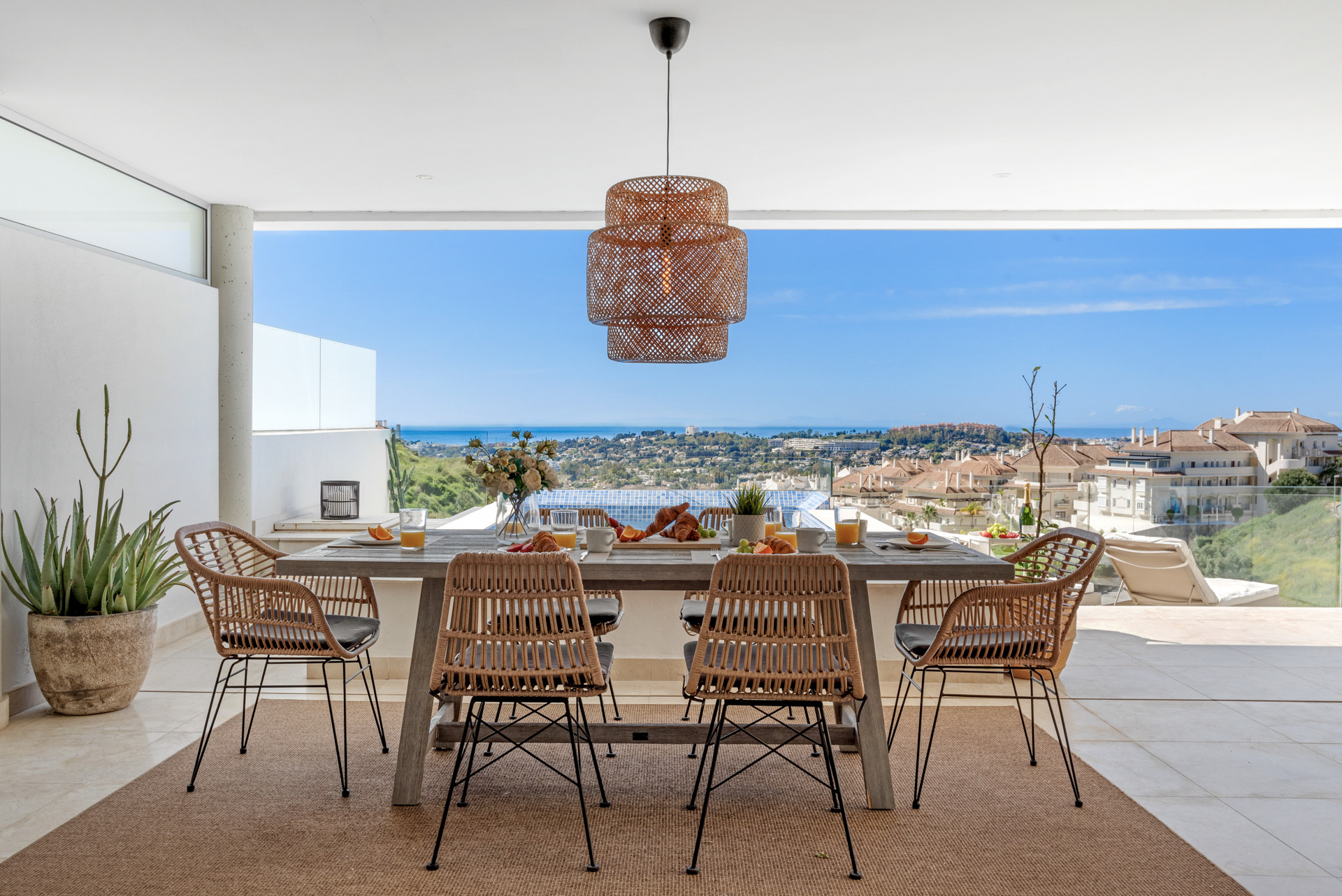Välkommen till Casa La Morelia, ett vackert designat 2-sovrum, 2-badrum reträtthem inbäddat i sluttningen av Nueva Andalucía, med hisnande panoramautsikt över Medelhavet. Detta stilfulla gömställe kombinerar inomhuskomfort med sömlös utomhusvistelse och erbjuder en fridfull flykt bara några minuter från stränderna och energin i Puerto Banús.