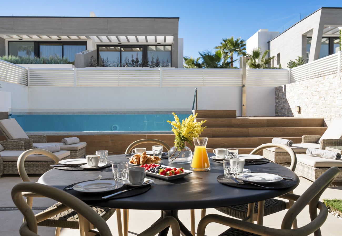 Gå ut för att njuta av det soliga vädret på den privata terrassen, som är utrustad med utemöbler och en matplats. Terrassen leder till din egen pool, där du kan svalka dig eller slappna av på solstolarna. Fastigheten är västervänd, vilket innebär att du kommer att ha solljus hela eftermiddagen och kvällen, perfekt för att njuta av solen eller äta middag när solen går ner. Det finns också en takterrass med fantastisk utsikt över den omgivande grönskan och bergen, med en lyxig jacuzzi, vilket gör det till den perfekta platsen för morgonkaffe, kvällsdrink eller avkoppling under stjärnorna.
