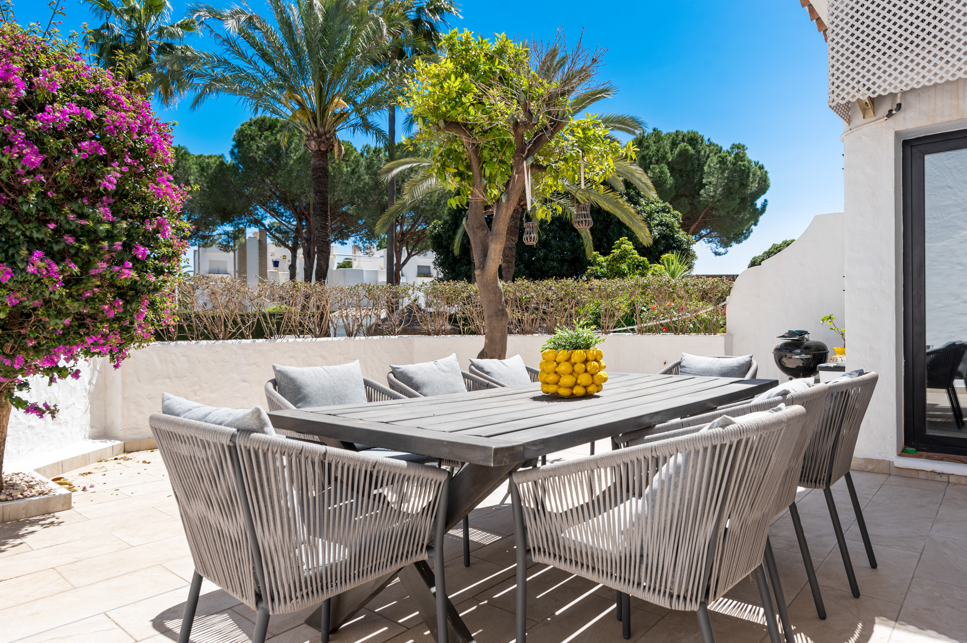 Casa Palm är ett vackert renoverat radhus med 3 sovrum och 3 badrum i den prestigefyllda Los Naranjos Country Club, Nueva Andalucía. Denna sofistikerade bostad kombinerar modern elegans med medelhavets charm och erbjuder en lugn tillflyktsort bara några minuter från Marbellas bästa golfbanor, stränder och livliga matställen. Vardagsrummet och matplatsen med öppen planlösning utstrålar värme och stil, med plysch moderna möbler, en mysig öppen spis och stora skjutdörrar som leder direkt till trädgårdsterrassen. Det eleganta svarta köket är en slående kontaktpunkt, utrustad med avancerade apparater, polerade stenytor och gott om förvaring, vilket skapar ett sömlöst utrymme för matlagning och underhållning.