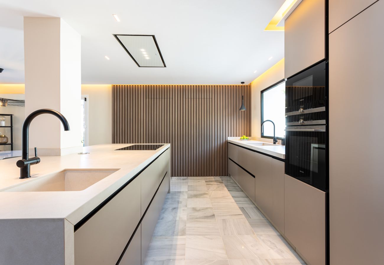 Designad med rena arkitektoniska linjer och genomgående stora glaspartier är villan badad i naturligt ljus och erbjuder en sömlös inomhus-utomhus levnadsupplevelse. Det centrala vardagsrummet är öppet och inbjudande, och flödar in i ett fullt utrustat modernt kök och matplats - perfekt för avkoppling eller umgänge i nedtonad lyx.